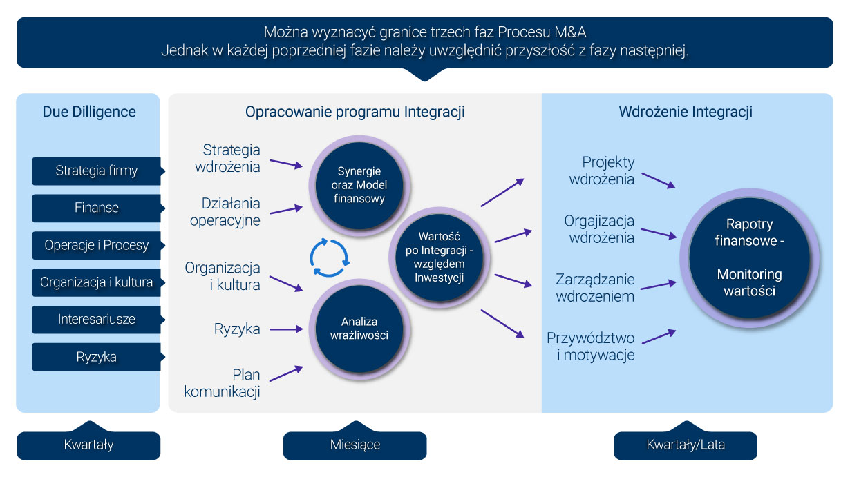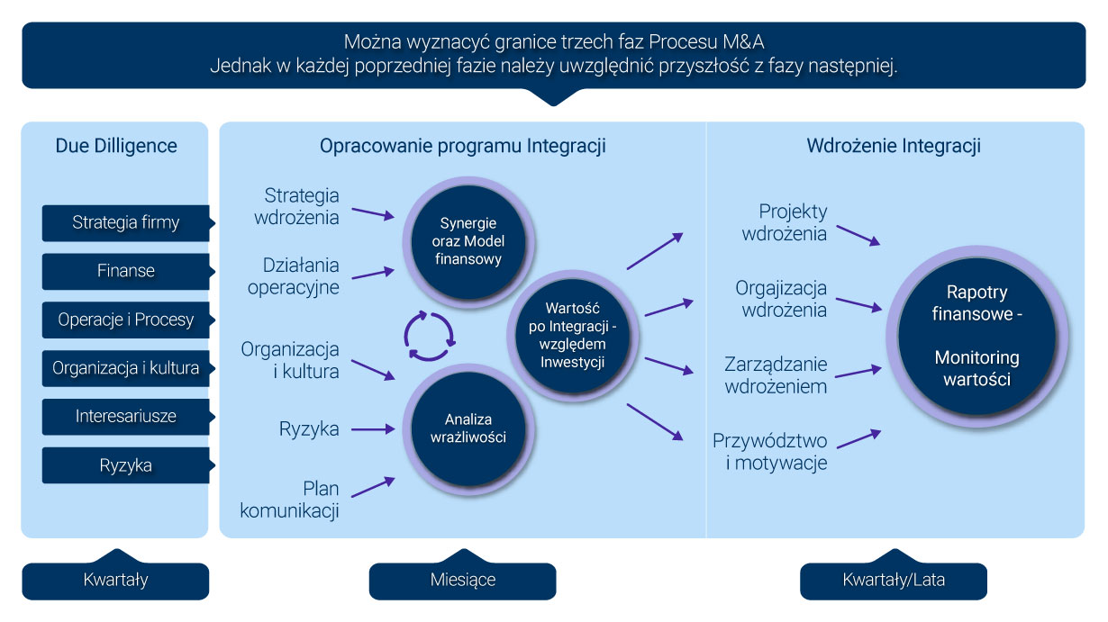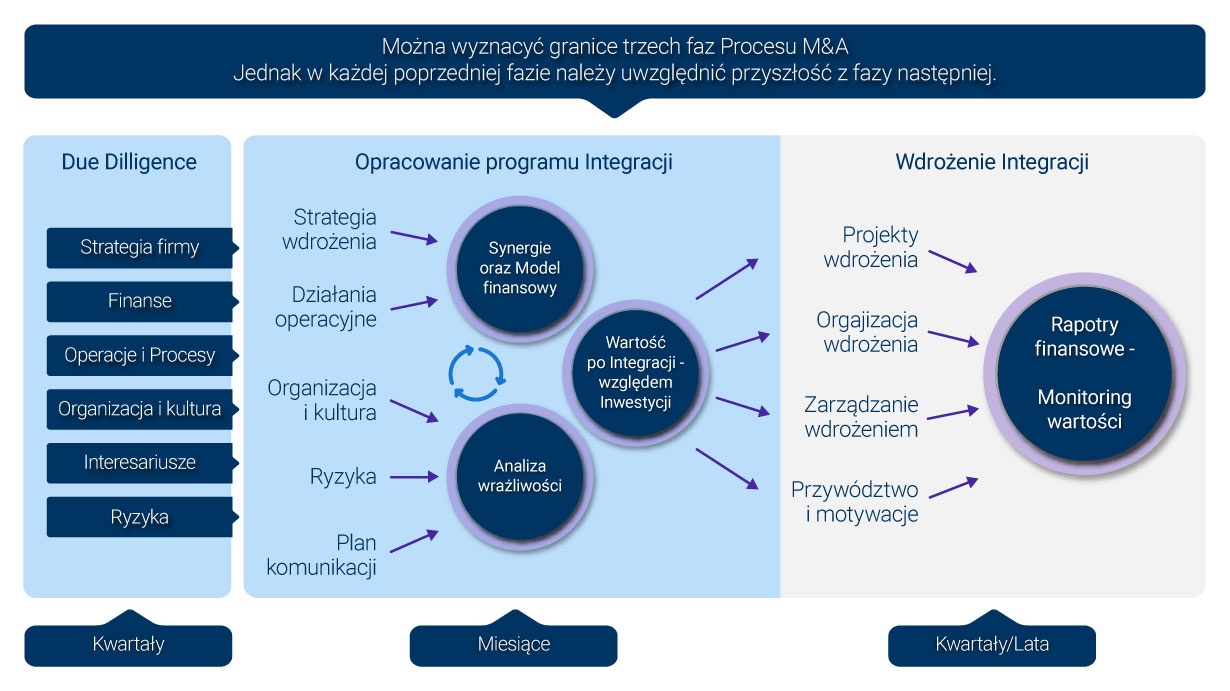 Proces M&A dzieli się na trzy wyrazne fazy: Due Dilligence, Opracowanie Programu integracji, oraz wdrożenie Integracji.
