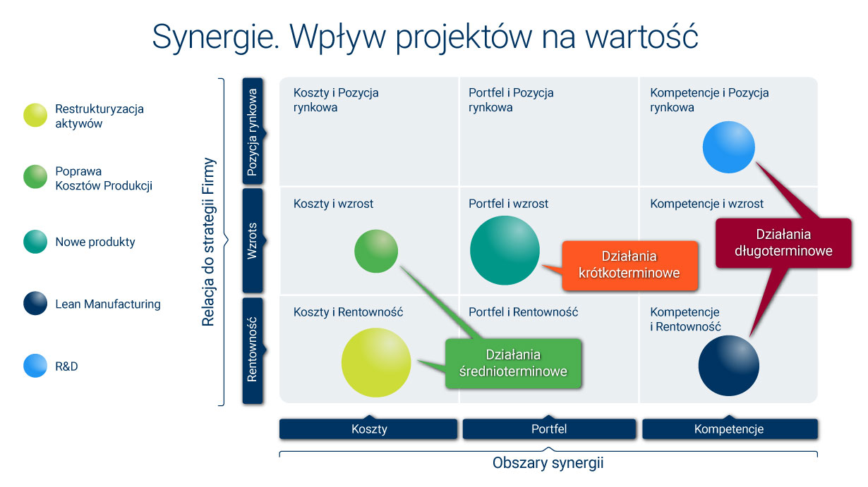 W ramach Projektu wyznaczone zostały następujące strumienie działań dla uzyskania Synergii: Sprzedaż, Marketing & R&D, Produkcja/Logistyka, Zakupy, Finanse oraz HR.
