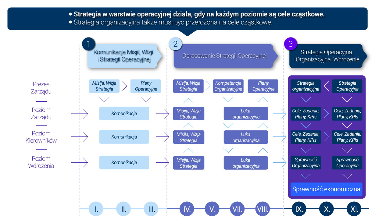 Jednocześnie, na wszystkich poziomach organizacji Firmy nastapiło połączenie Celów i Mierników pomiędzy Strategią operacyjną a Strategią organizacyjną. W ten sposób, określone cele operacyjne zostały połączone z celami organizacyjnymi w każdym dziale -Marketingu, Finansach, Sprzedaży itd.